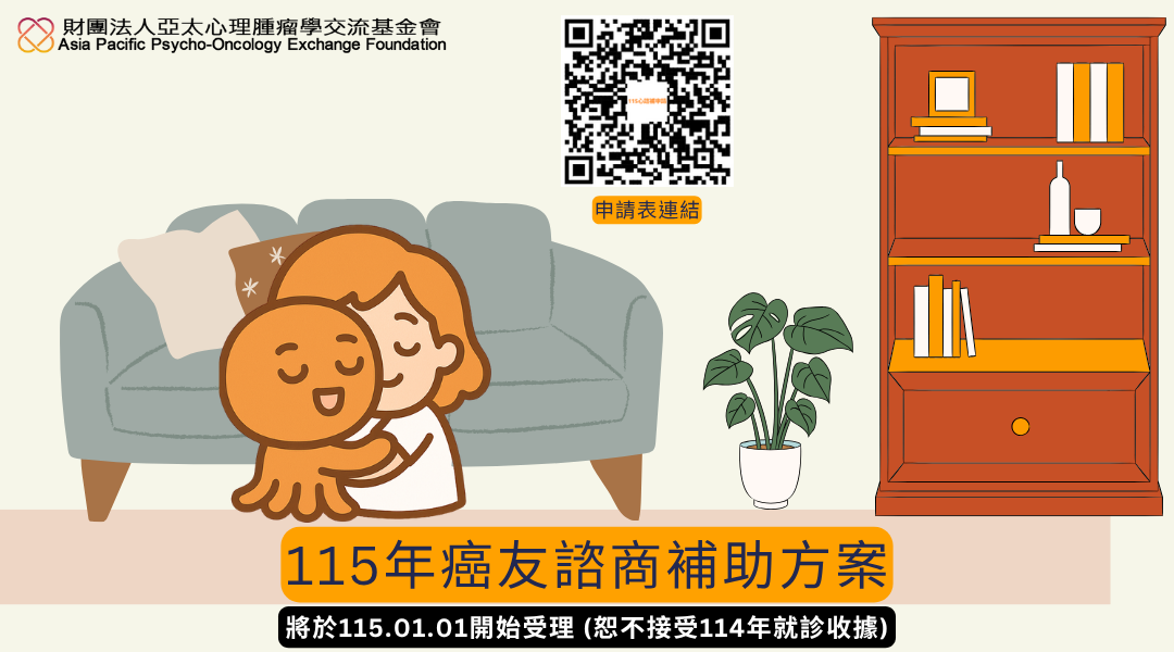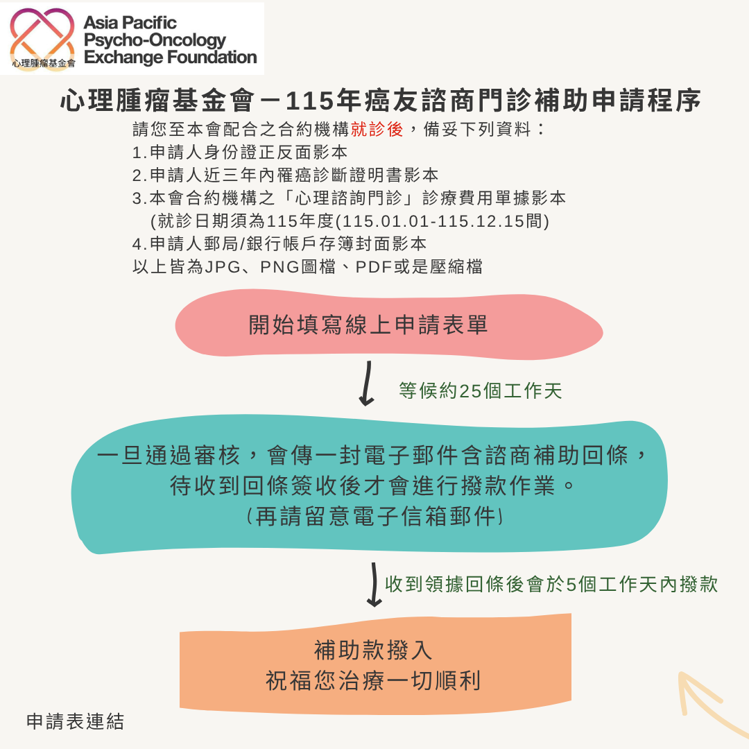 1、 常見罹癌之病友於治療期間,會出現情緒困擾而想與專業的精神科/身心科醫師,或諮商心理師/臨床心理師談談,卻無力負擔自費心理諮詢門診費用(非健保給付範圍及醫療掛號費)。財團法人亞太心理腫瘤學交流基金會(以下稱本會)鼓勵癌友至本會**合約機構**「心理諮詢門診」看診,以降低治療過程中的心理不適,重回正常生活。
